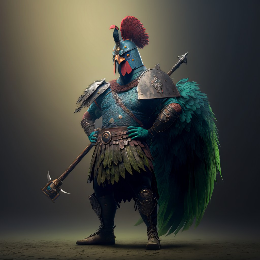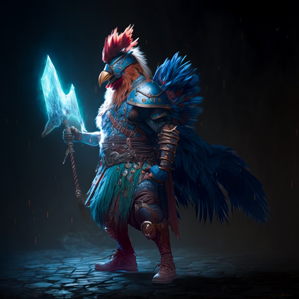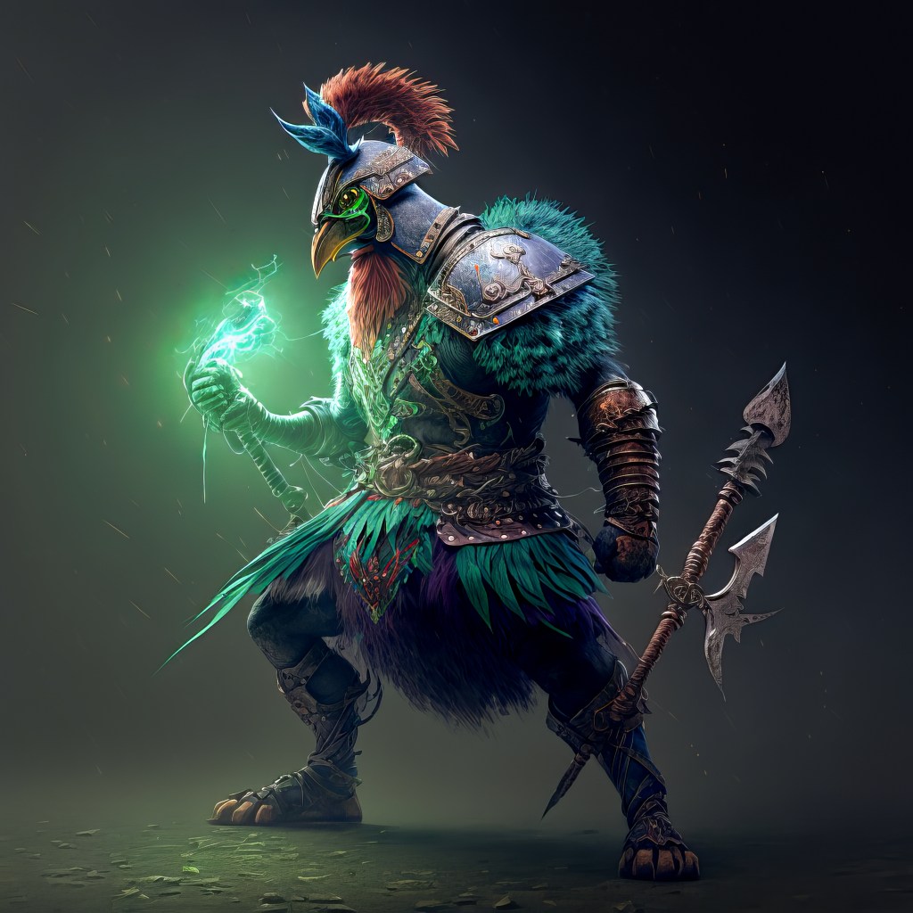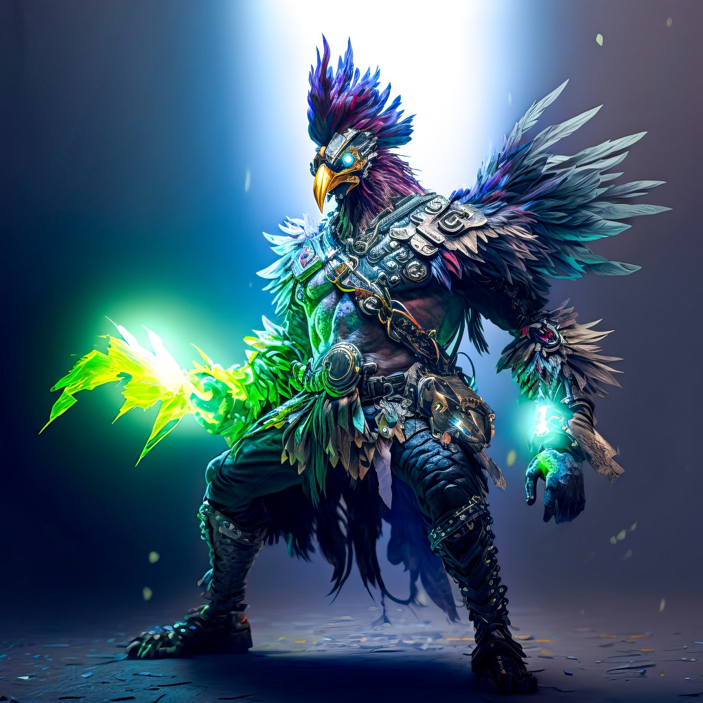 /Imagine Prompt: full body rooster, green-headed, warrior, armored, strong, medievalpunk, cyberpunk, holding Viking axe with blue aura lightning, cinematic lighting, full body, ultra wide angle, gritty, atmosphere, unreal engine 5, 4k, 8k, 16k, 32k –v 4 – Upscaled by @ironclaw (fast)