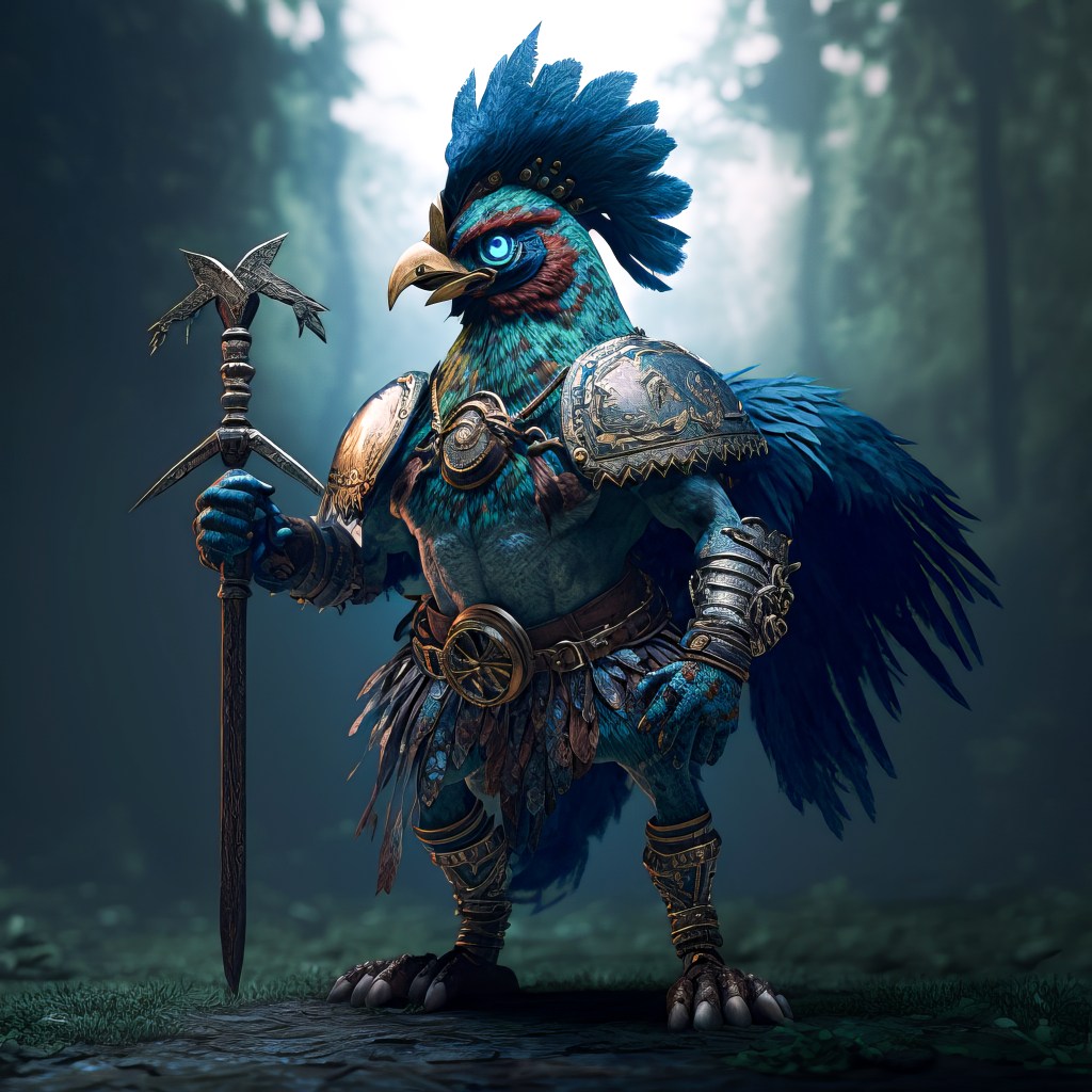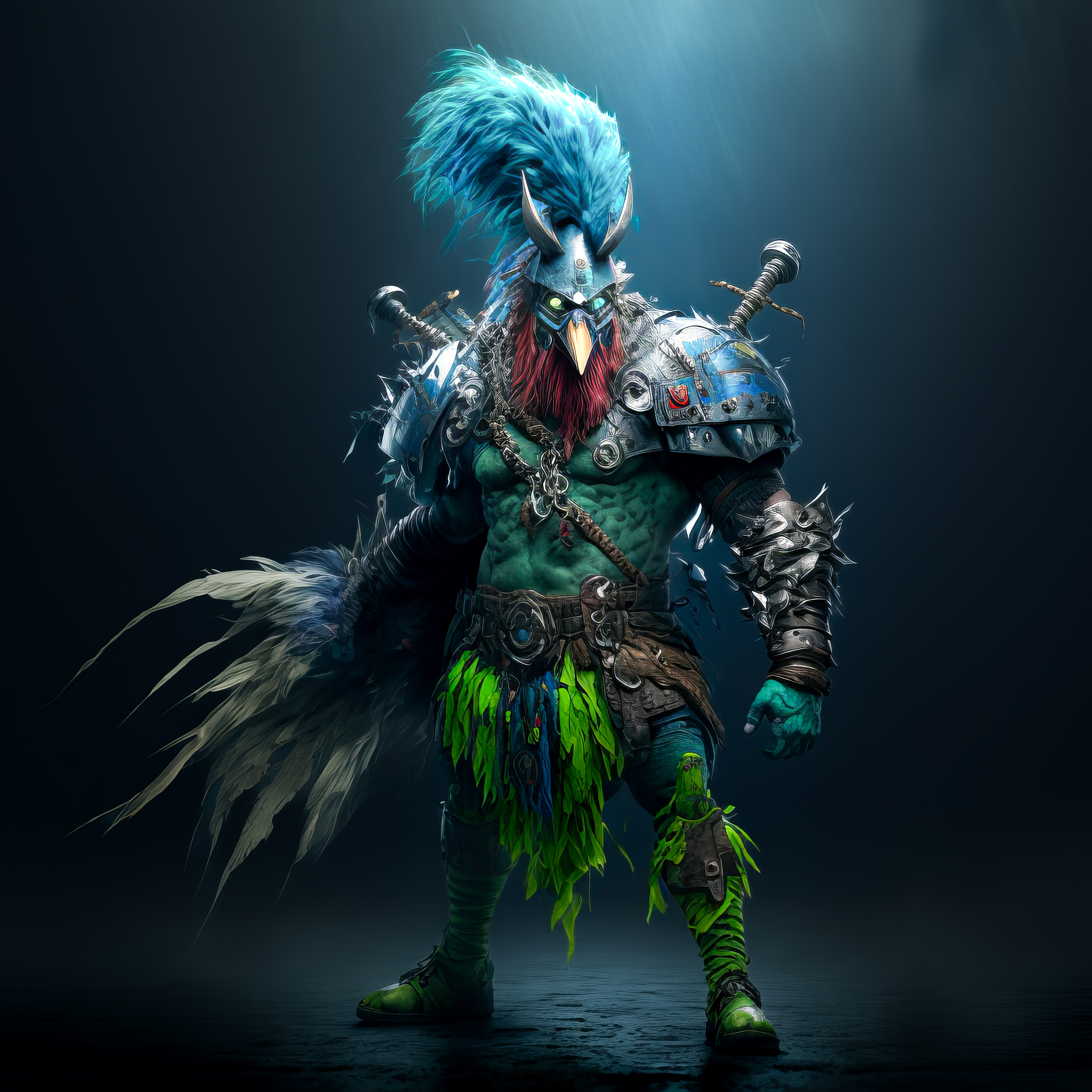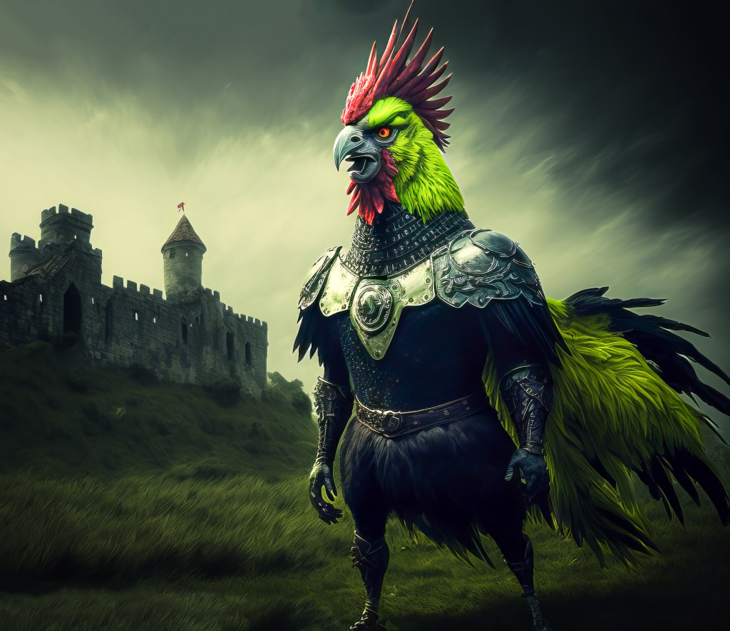 /Imagine Prompt: full body rooster, green-headed, warrior, armored, strong, medievalpunk, cyberpunk, holding Viking axe with blue aura lightning, cinematic lighting, full body, ultra wide angle, gritty, atmosphere, unreal engine 5, 4k, 8k, 16k, 32k –v 4 – Upscaled by @ironclaw (fast)
