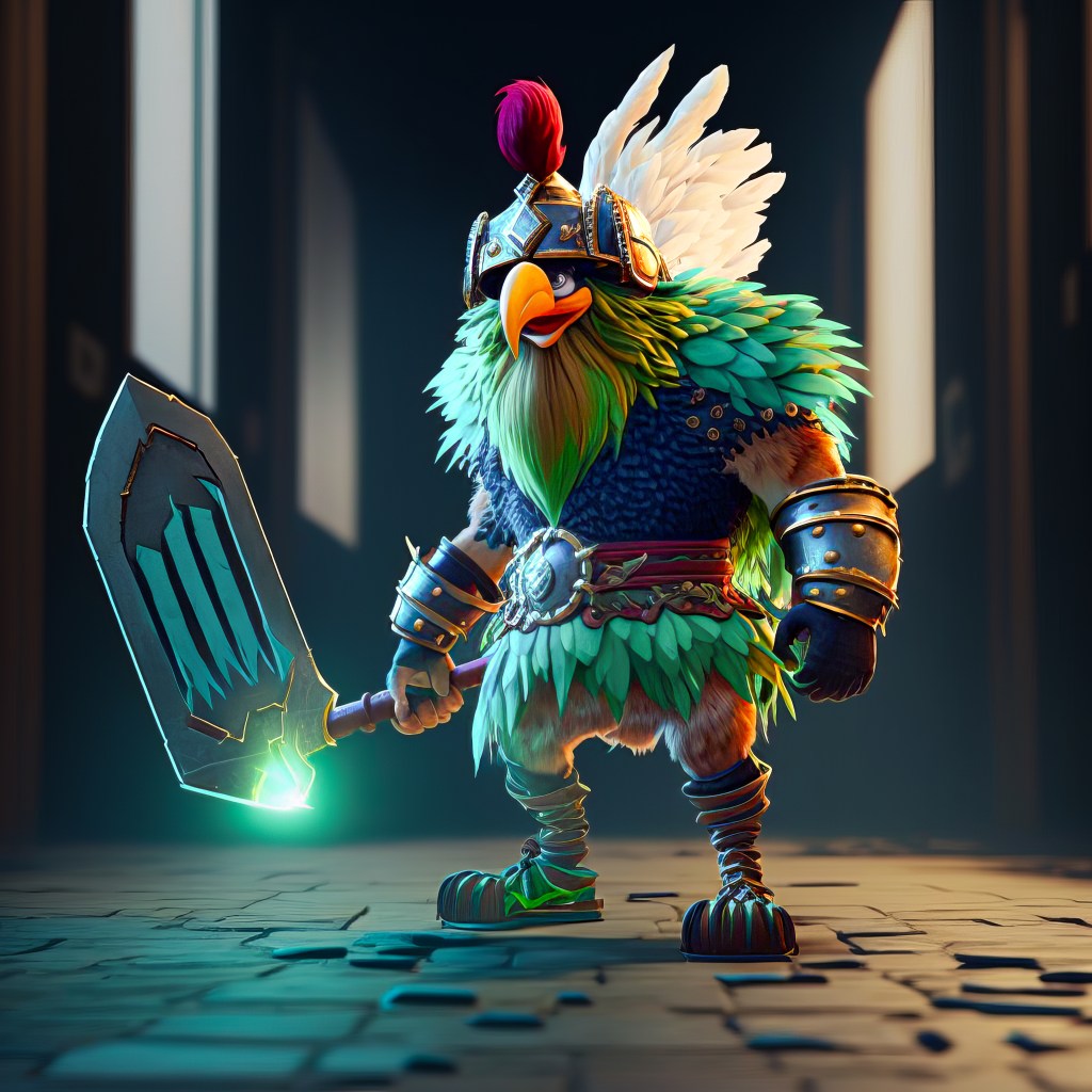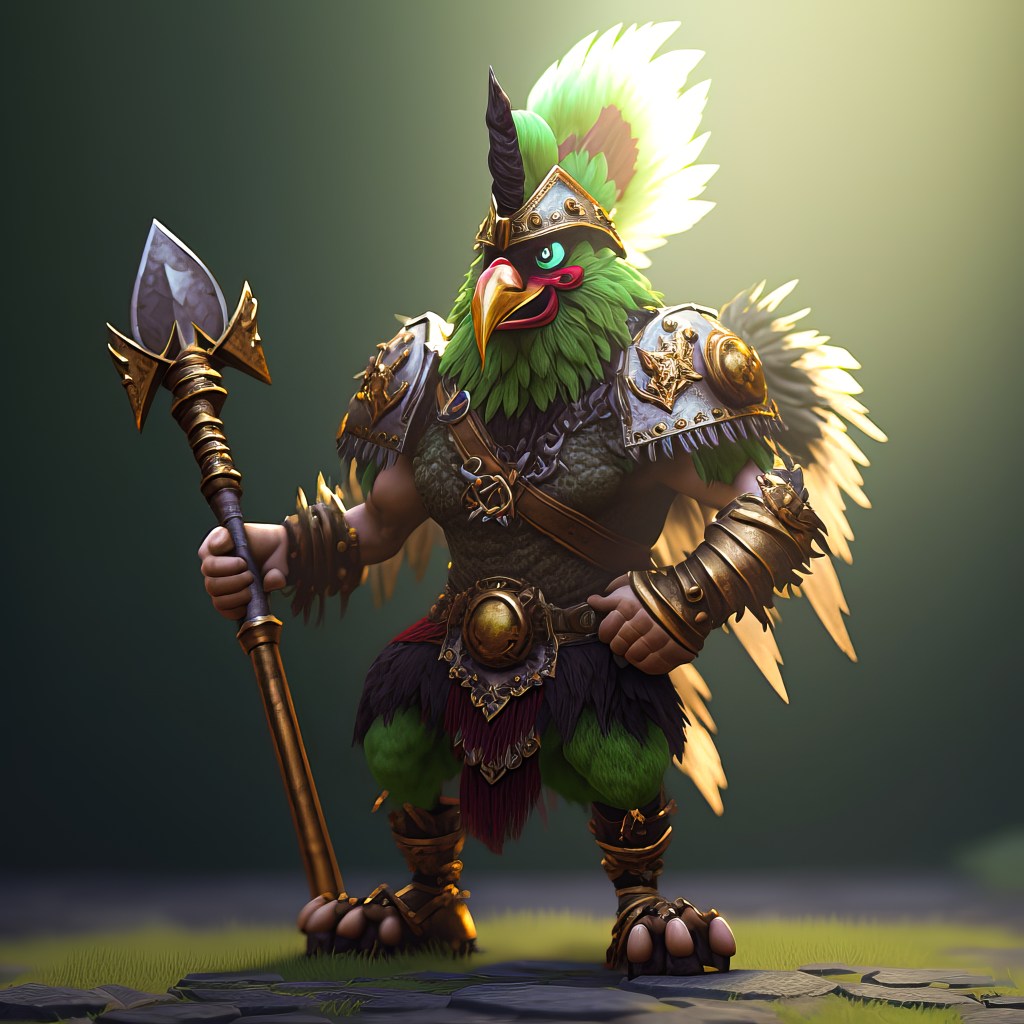 /Imagine Prompt: medievalpunk rooster warrior holding a glowing aura Viking battle axe, bright green head feathers, big eyes, wide angle, full body, drone footage, 4k, photo realistic, high detail, high definition, unreal engine 5, 4k, cinematic lighting, 3d shading –v 4 – Upscaled by @ironclaw (fast)