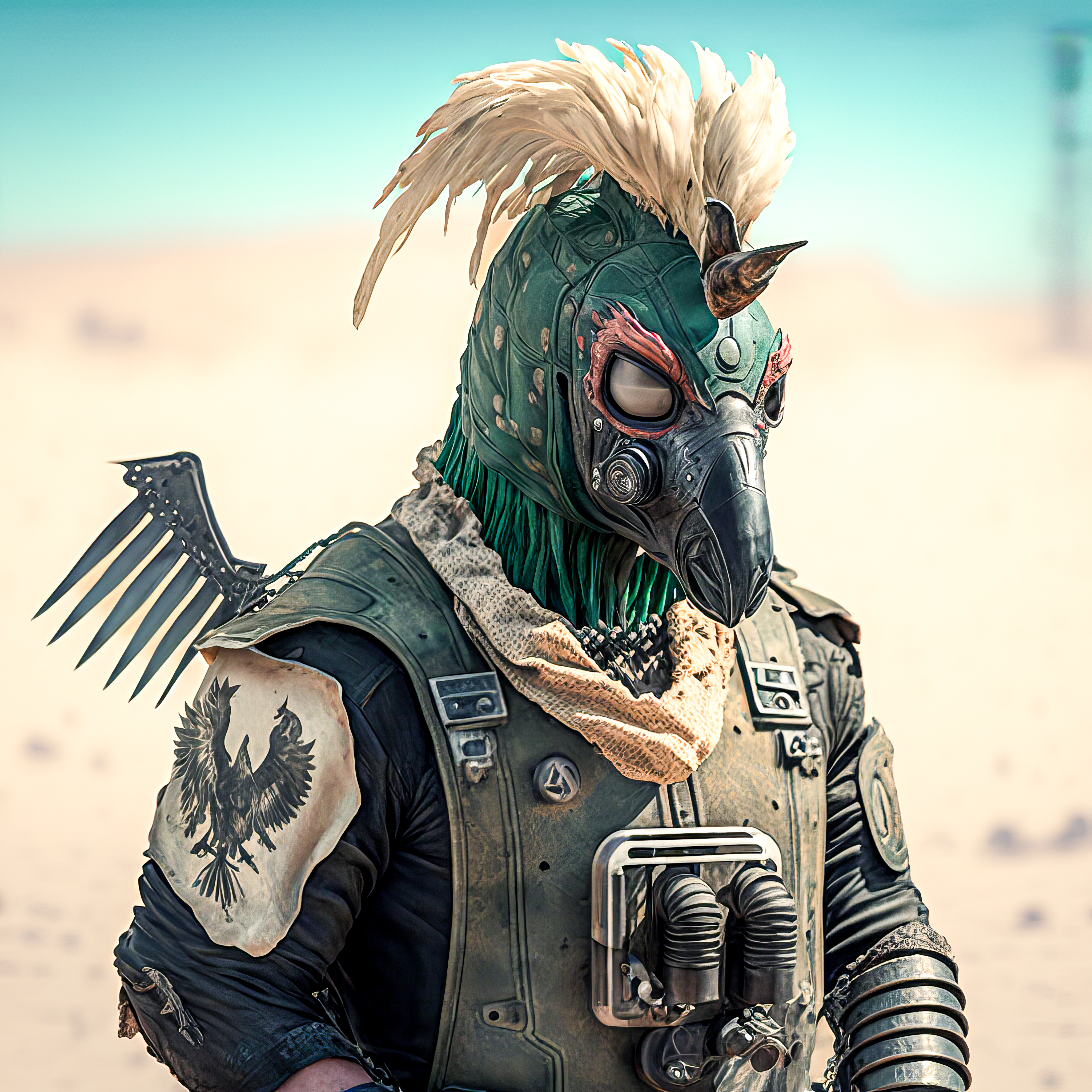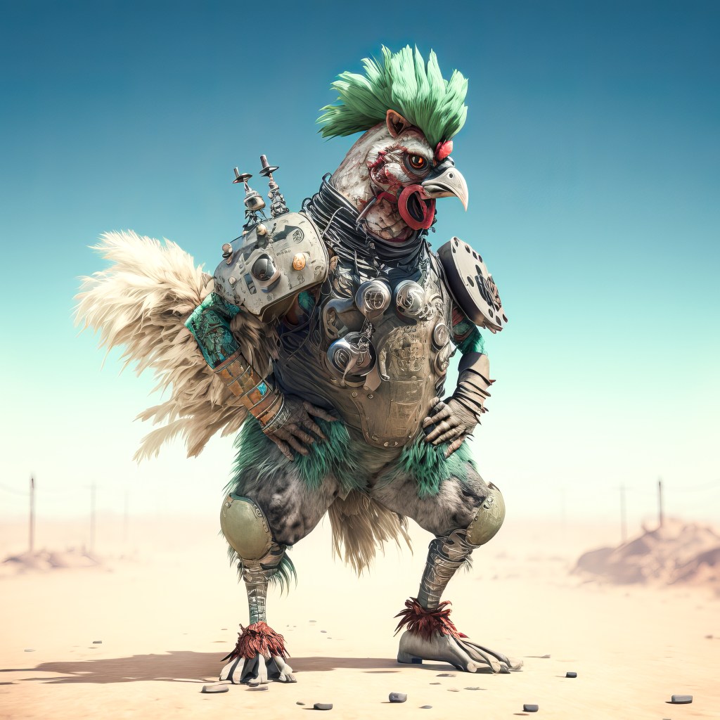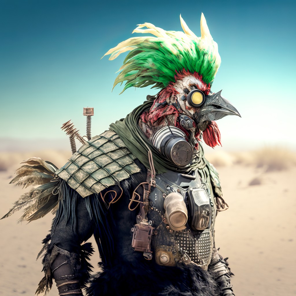 /Imagine Prompt: cockpunch rooster wasteland style, wastelandpunk, body armor, full shot, full body, wasteland background, green-headed, dangerous, sinister, gritty, sandy, cinematic lighting, 4k, 8k, ultra definition –v 4 – Upscaled by @ironclaw (fast)