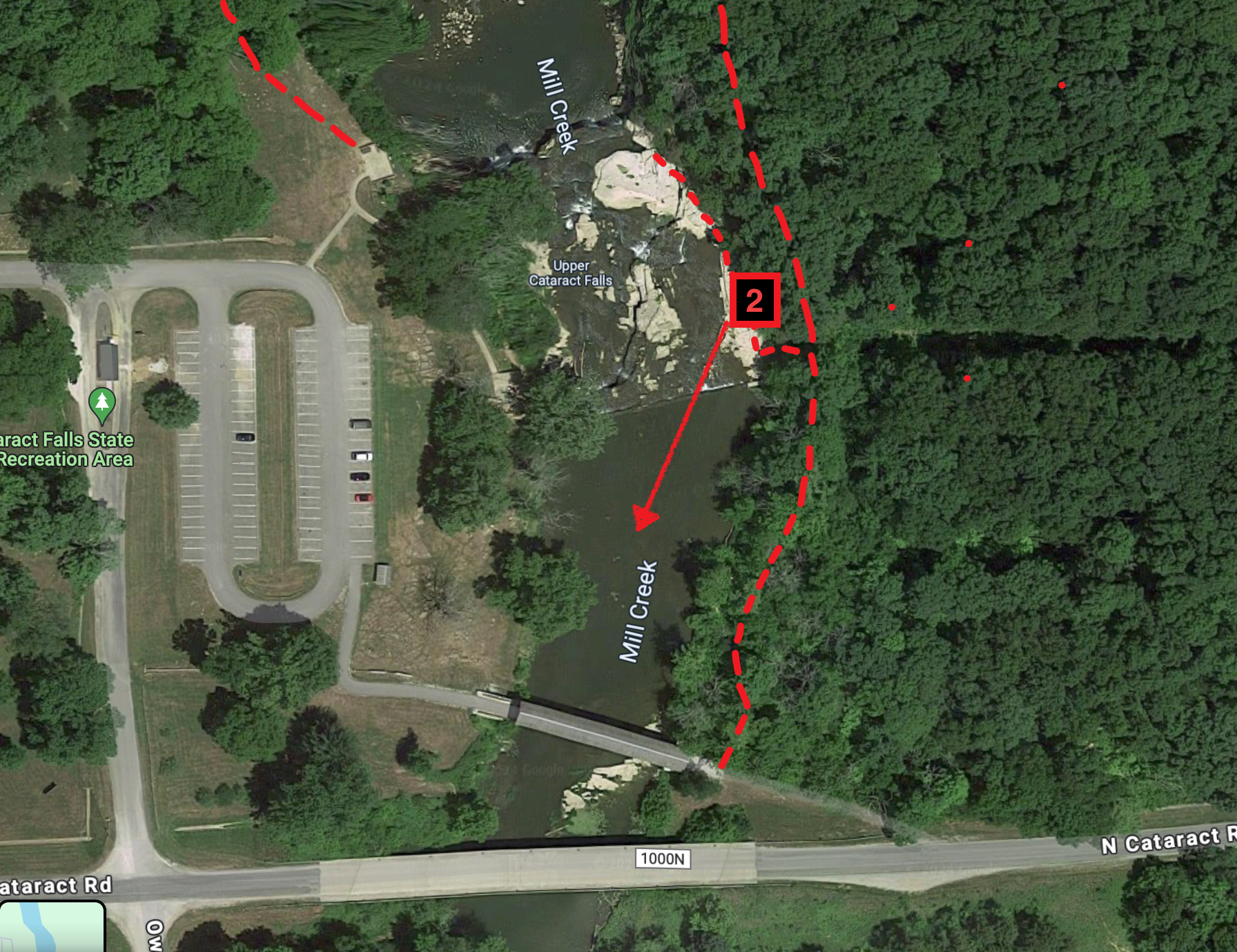 There are some unmarked trails on the east side of the falls if you cross the fence on the far end of the covered bridge or walk the roadway to the east side of the river and enter the woods just after the fenced area. The trail is well used and easy to spot. I marked this on the map below. I would consider this trail advanced. It is a narrow single track and it takes you along the cliff on the east side of the falls. If you follow it to the end you will go down into the ravine by the river where you can access the east side. The easier way to go is drive around on the gravel road and park at the small gravel lot.