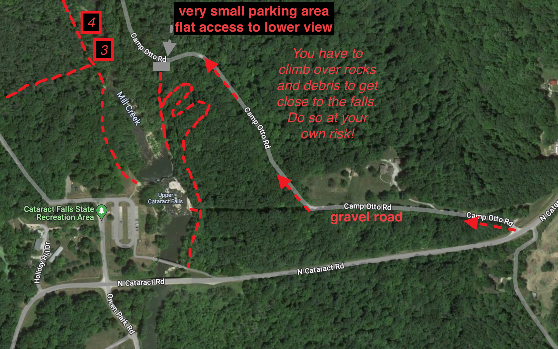Not all trails at Cataract Falls are marked or show up on maps. I found them easy to navigate in warmer weather. I would not recommend leaving marked trails if you are new to the area. This is a rocky area and it is easy to slip off a rock or edge in the winter.
